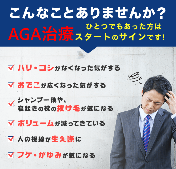 上記に1つでもあてはまる方は、AGA治療を行っている専門クリニックで適切な治療を受ける必要があります。