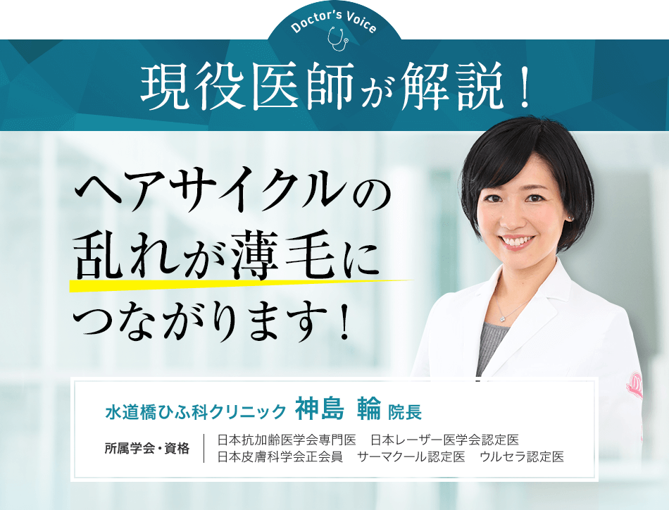 薄毛の原因は、男性ホルモンによる影響と頭皮の血行不良などによる頭皮環境の悪化、ほかにも生活習慣の乱れや頭皮ケアを怠ることでヘアサイクル(毛周期)が乱れ、髪の毛が正常に成長しなくなり、抜け毛が増えて薄毛になってしまいます。