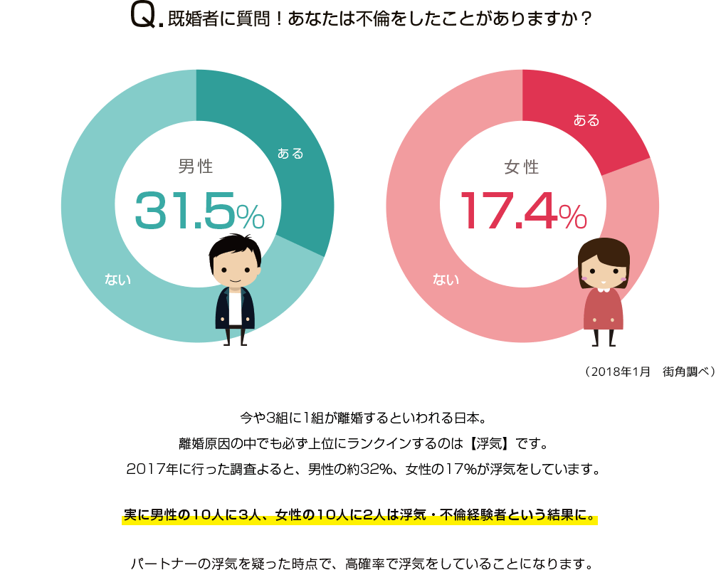 街角相談所が行った調査では、既婚者の男性の約32%、女性の約17%が浮気をしているという結果が出ました。